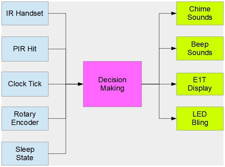 Happenings or Events occur such as shown on the left … such as the clock ticks, the PIR senses motion and so on. The clock software must then decide what to do. So, for example, if the clock is currently showing the time in a hh:mm:ss format and the clock ticks one second then the E1T display will need updating, the clock colons, if flashing, will need their state changing and if a tick sound is played then that will need to be started.