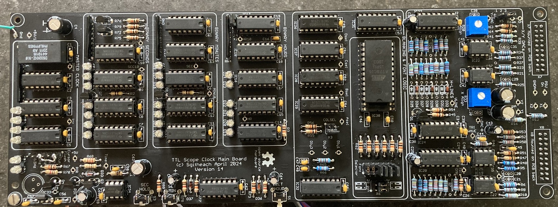 Rather than use discrete semiconductors and passives, I migrated to using TTL for the time-keeping and display logic. Then use OPAMPs for the analogue processing to form the drawn characters. The CRT side of things: power supply, deflection amplifiers etc. could be derived from Scope Clock Due. I could use a simpler power supply for the CRT heater and a simpler blanking amplifier. Nick Stock suggested that I use the time-keeping from his KoolKlox and keep the BCD LED time display. This helped a lot as the point of the clock is that it is a nixie clock that uses TTL. I swapped out some of the design but the time-keeping section is basically the same.