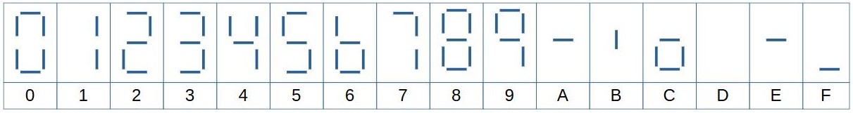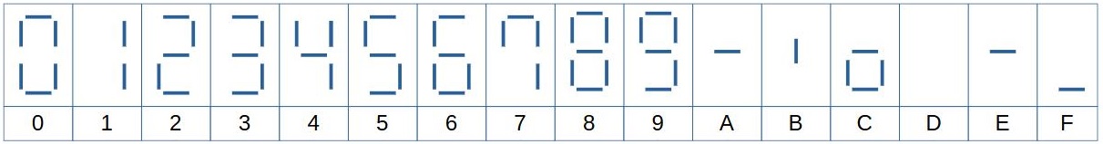 The EEPROM holds about a dozen fonts at the moment; there is room for a lot more. Fonts can be variations on the standard 7 segments. Such that the following font which has additional lines added to character '6', '7' and '9'. My favourite.