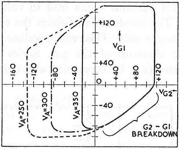Fig. 6.2. Ignition characteristic of arc tetrode. Triggering is usually effected by breakdown between G2 and G1.