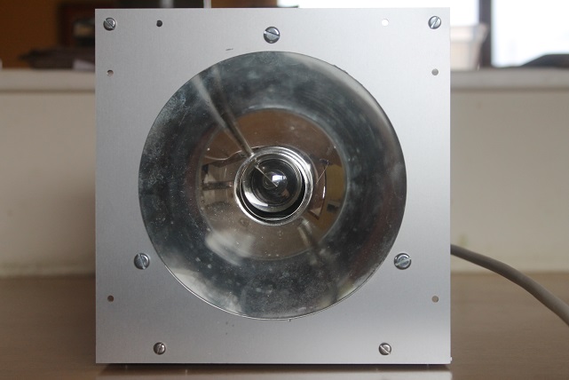I constructed a simple metal case using sheet, angle and square section aluminium. The front and back panels are laser cut and engraved (oooops, again not-so-1950's but the equivalent mechanical milling and engraving would have been possible in the 1950's to give a similar appearance). The case size was made as small as I could conveniently make it and the transformer located centrally and low down to give a steady feel and a low centre of gravity. Luck on ebay provided the 125mm diameter parabolic reflector (from some sort of light fitting). The following gallery illustrates the construction.
