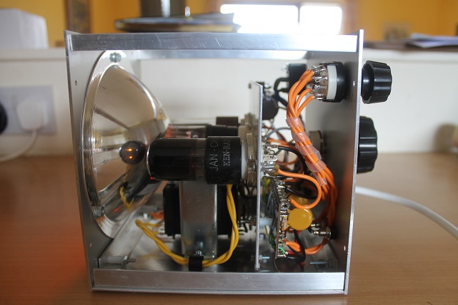 The only real modification I made to the design was to add a socket to output the oscillator square wave attenuated to about 3V peak so I could measure the frequency (using a not-so-1950's frequency meter).