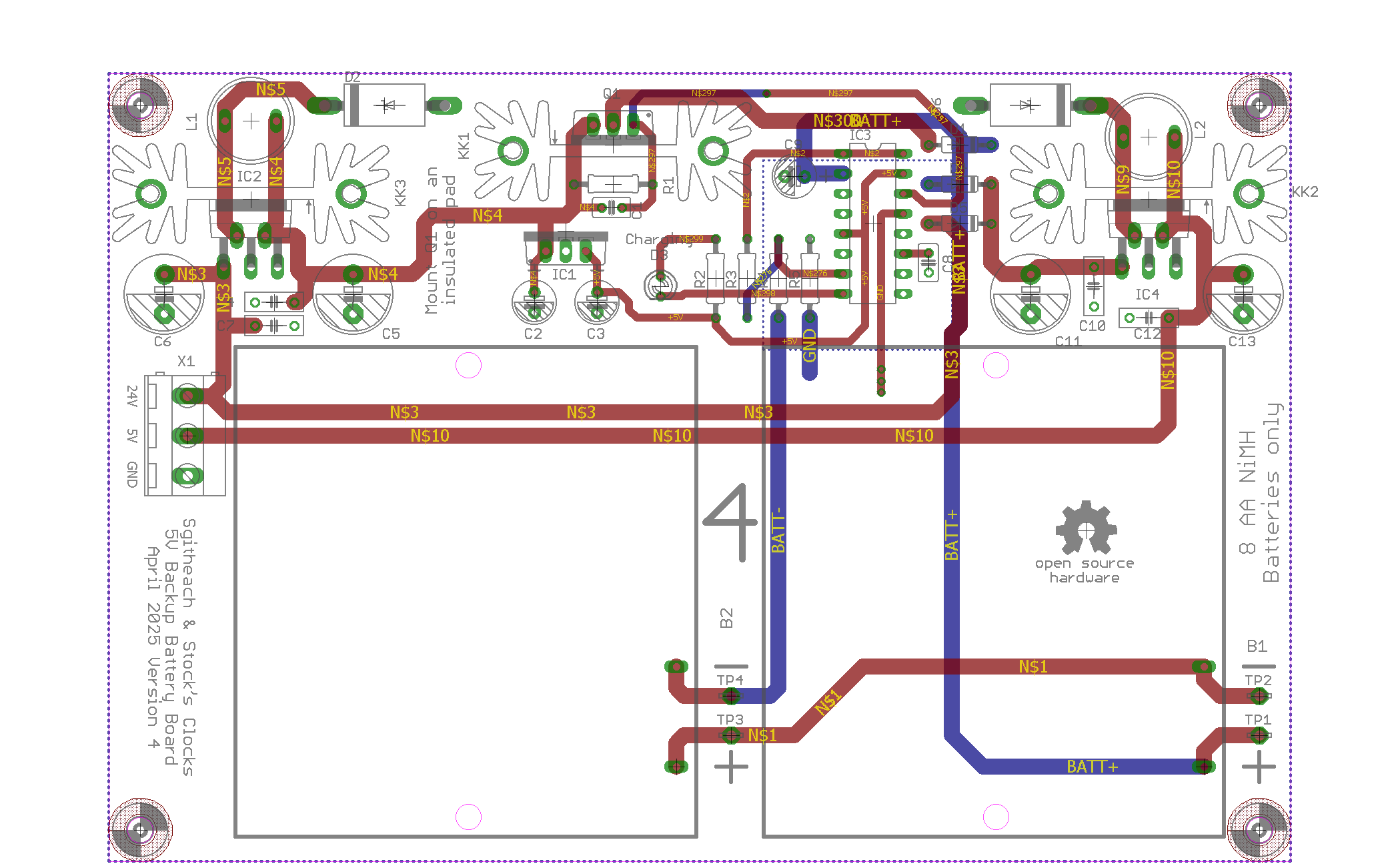 The 5V output supply regulator is based on a LM2576-5 switching regulator. Diodes D3 and D4 block the batteries from discharging into the DC supply or discharging when the supply is connected respectively.